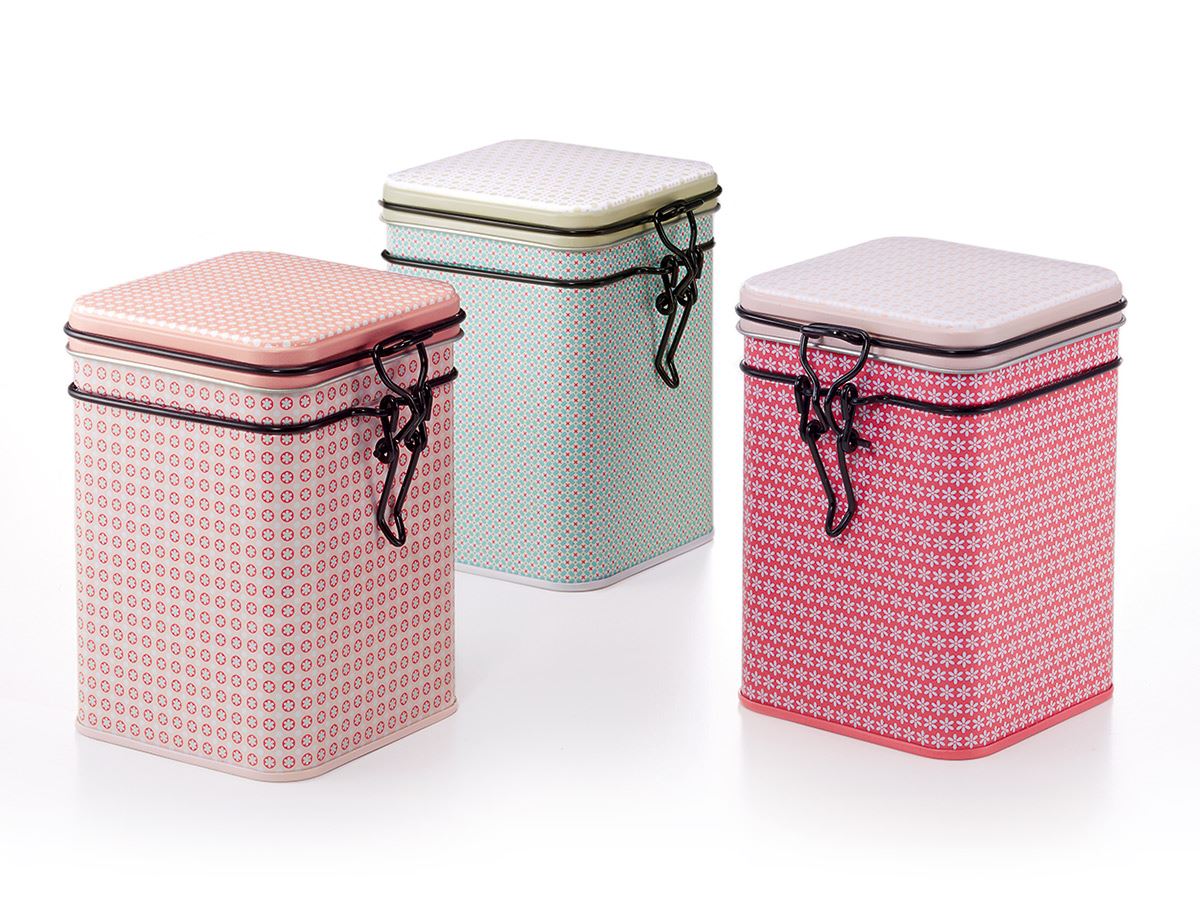 Scatola quadrata con simpatica stampa quadrettata disponibile nei colori: rosa, fuxia, verde La scatola di latta con dimensioni 9,8 x 6,5 x 6,5 cm è ideale per conservare circa 100 g di tè. L'articolo riceve un tocco di alta qualità attraverso esclusivi accenti metallici dorati.Per cialde di caffè, tè e altro ancora