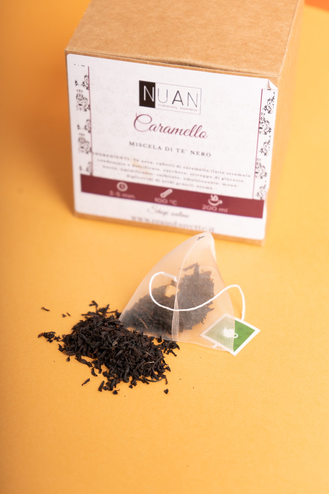 Tè nero, cubetti di caramello (latte scremato condensato e dolcificato, zucchero, sciroppo di glucosio, burro, umidificante, sorbitolo, emulsionante, monogliceridi di acidi grassi), aroma