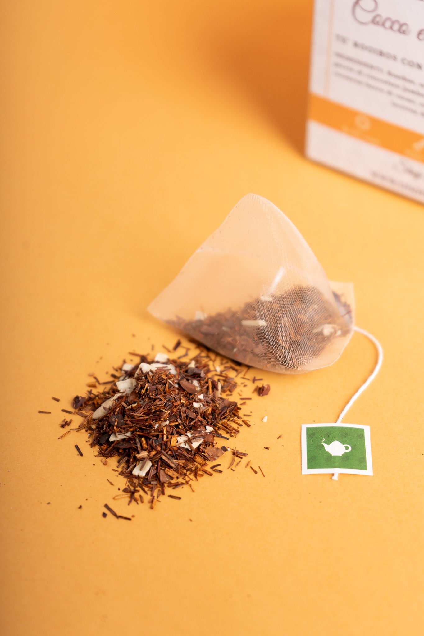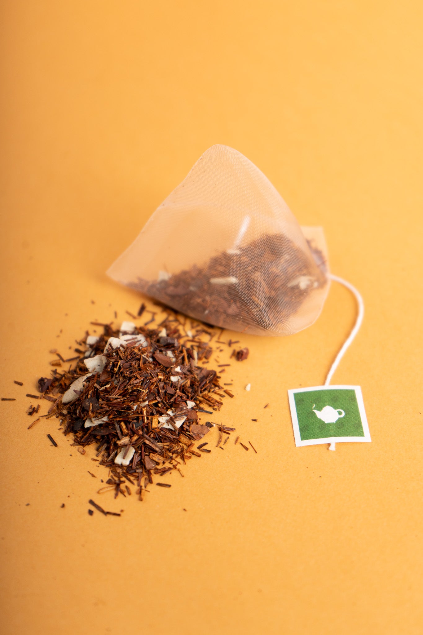 Rooibois, scaglie di cocco, pezzettini di cacao, gocce di cioccolato Jumbo (zucchero, macinato di fave di cacao con burro di cacao, cacao in polvere, emulsionante, leticina di soia), aroma