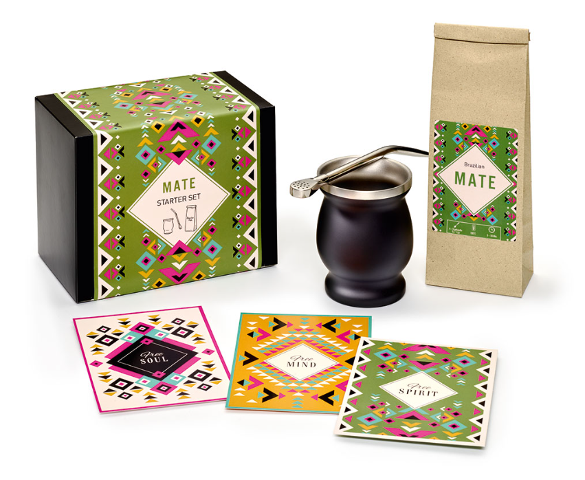 Un bellissimo set regalo sia per i novizi che per i fan del Mate. Il set comprende il recipiente per bere, il calabash, in un moderno ed elegante look nero opaco, la cannuccia, o bombilla, in pregiato acciaio inossidabile, e il nostro tè Mate brasiliano, confezionato nel nostro sacchetto di carta d'erba ecologica.