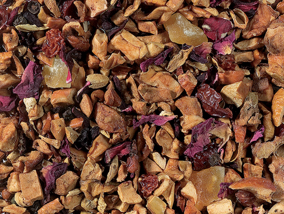 petali di ibisco, dadini di melone d'inverno (melone, zucchero, sciroppo di fruttosio), sultanine, fiocchi di ananas, fiocchi di papaya, fiocchi di mango, aroma.
