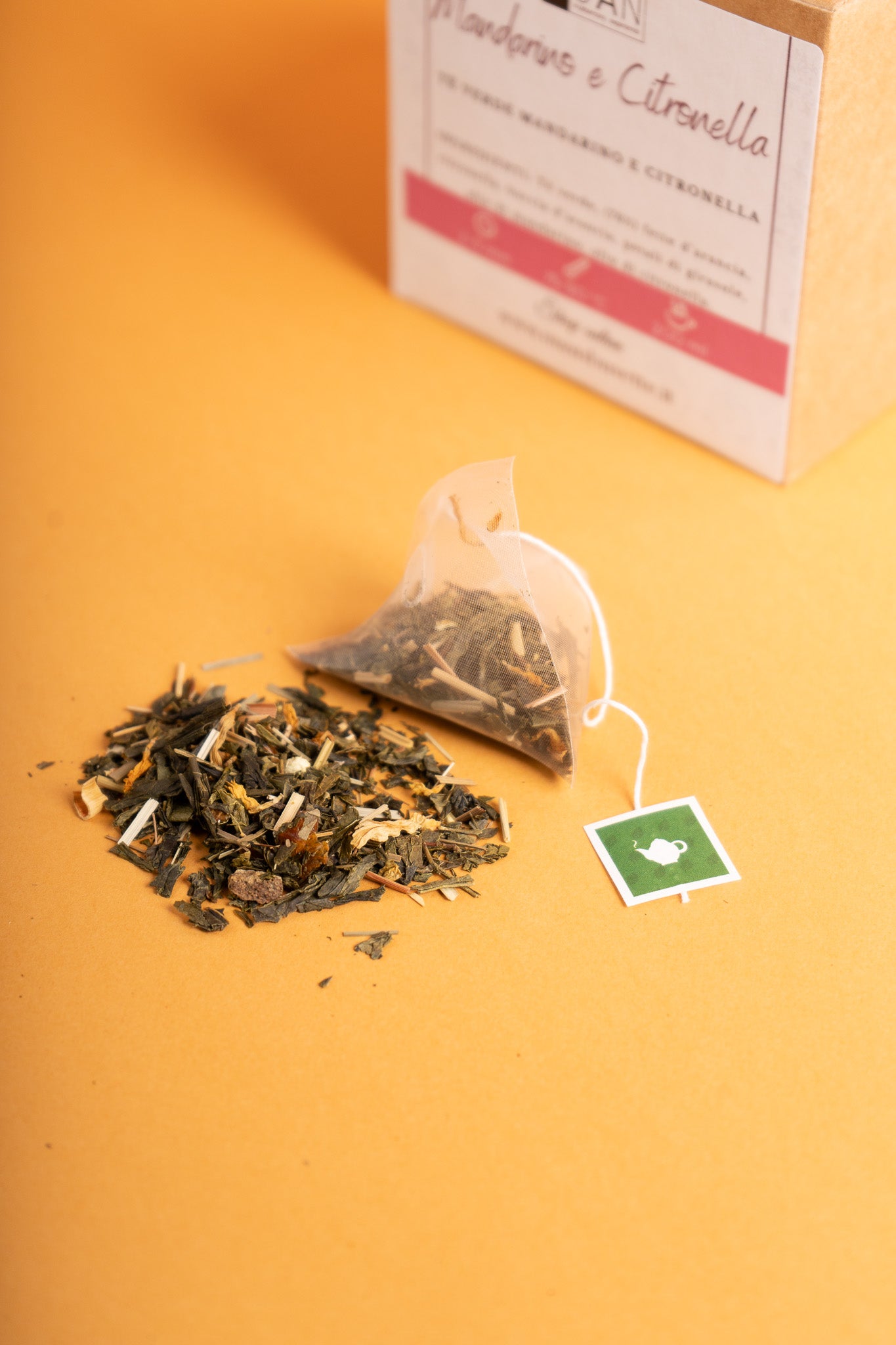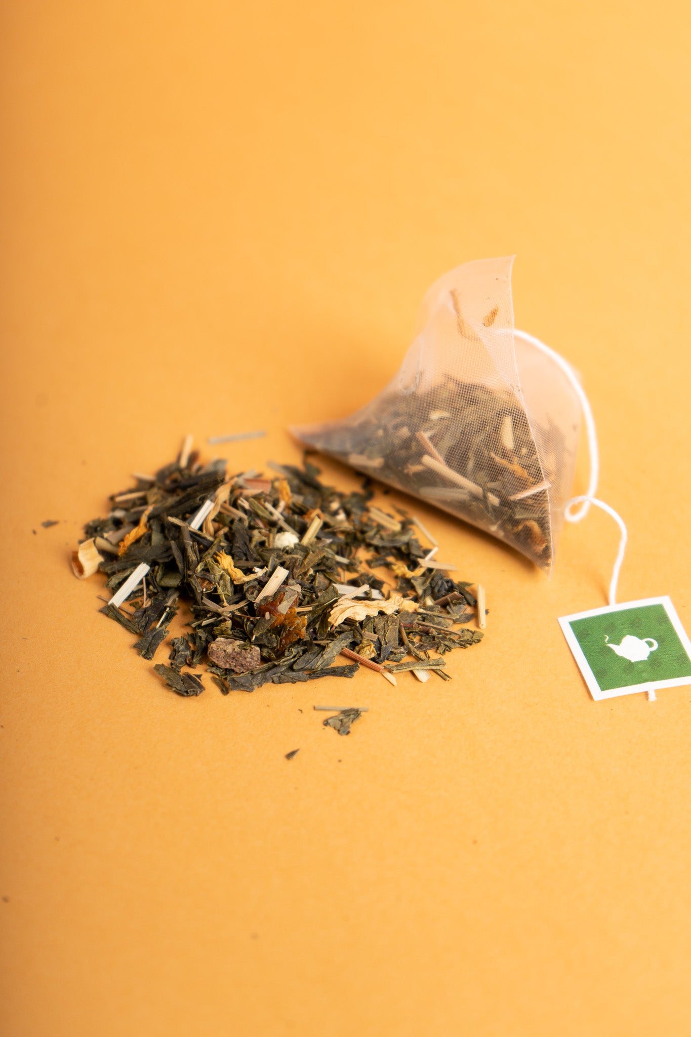 Pezzettini di mela, cubetti di ananas, tè Roobois, citronella, pezzetti di cannella, foglie di melissa, basilico, aroma, calendula