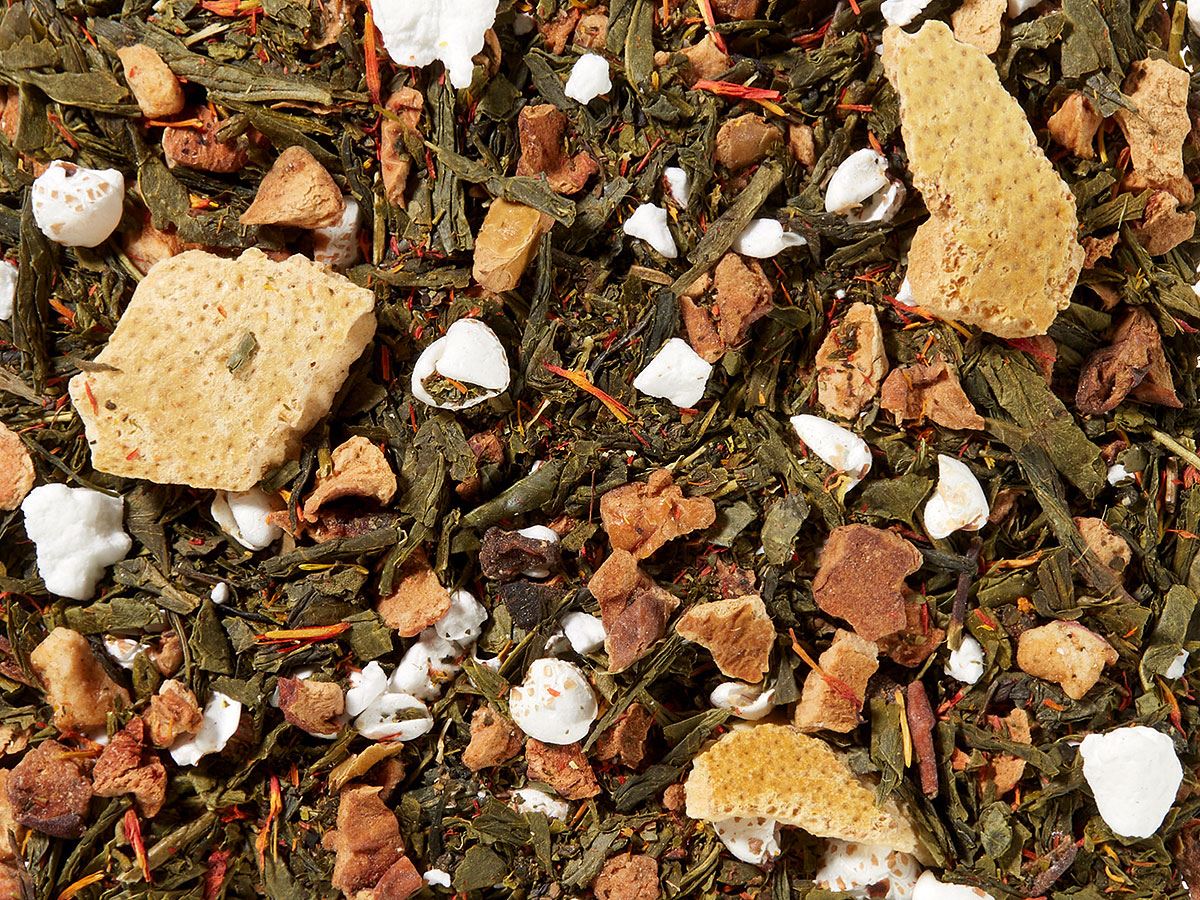 tè verde (53 %), pezzetti di mela, aroma, grano saraceno soffiato, granulato di limone liofilizzato (maltodestrina, frutta (succo di limone), olio naturale di limone, addensante: alginato di sodio), scorze di limone liofilizzate, cartamo