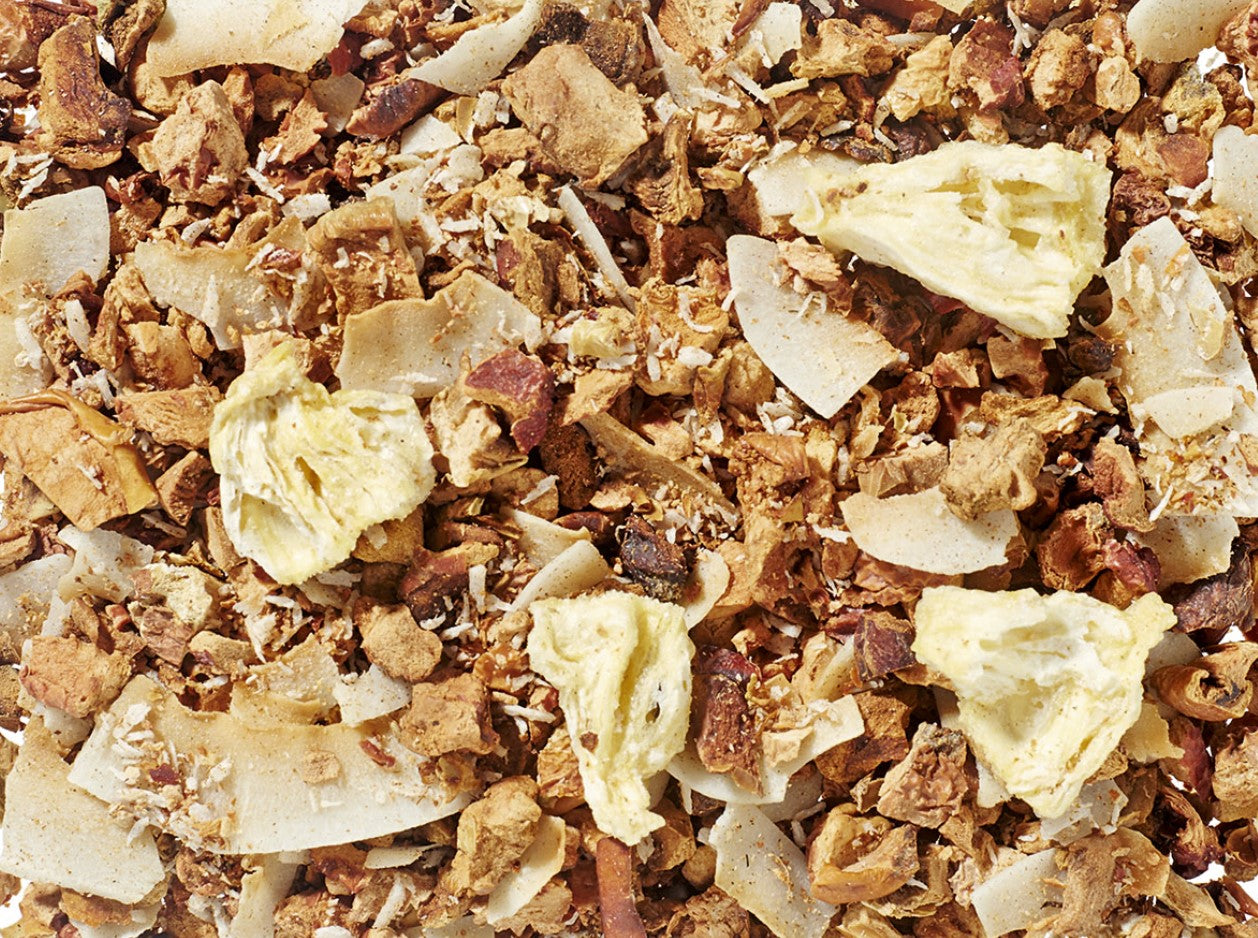 Ananas dolci e succosi si uniscono a sfumature morbide e cremose . Croccanti scaglie di cocco e delicate scaglie di cocco accompagnate da pezzi di ananas giallo liofilizzato