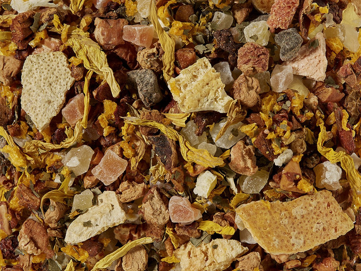 Pezzi di mela acida conferiscono un'acidità di fondo alla base di questa miscela, mentre la porzione aggiuntiva di foglie di mora fornisce una leggera dolcezza. Grandi pezzi di scorza di limone liofilizzata aggiungono un tocco estetico. Il profumo del frutto della passione corposo e succoso abbinato ai freschi sapori di agrumi ti rende semplicemente felice. Inoltre, delizioso servito freddo!