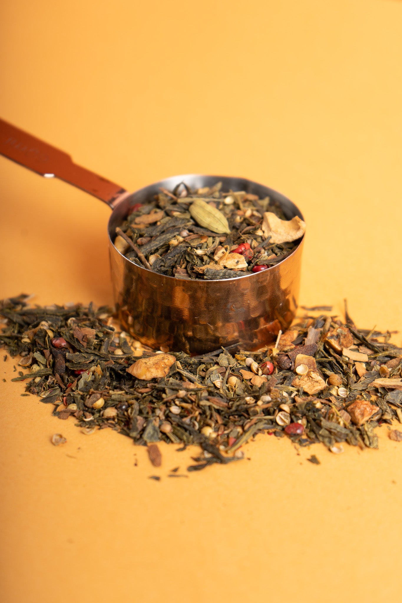 Ingredienti: Tè verde (47%), pezzetti di mela, pezzetti di cannella, coriandolo, aroma, spicchi di arancia, cardamomo,