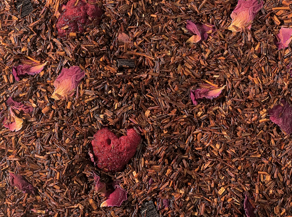 Tè Rooibos, aroma, lamponi interi liofilizzati, petali di rosa, pezzetti di vaniglia