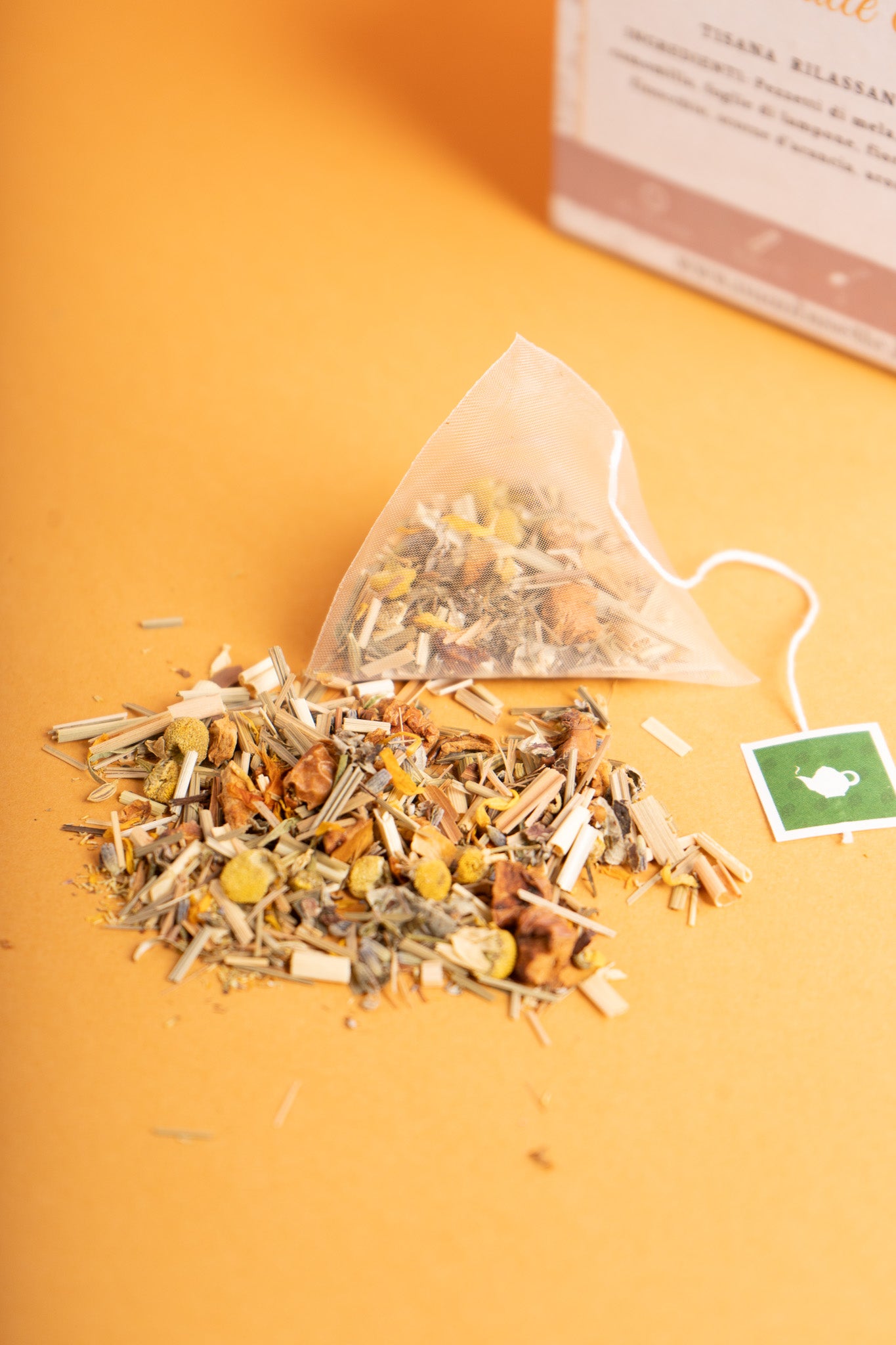 Pezzettini di mela, citronella, camomilla, foglie di lampone, fiori di lavanda, finocchio, scorze d'arancia, aroma naturale.