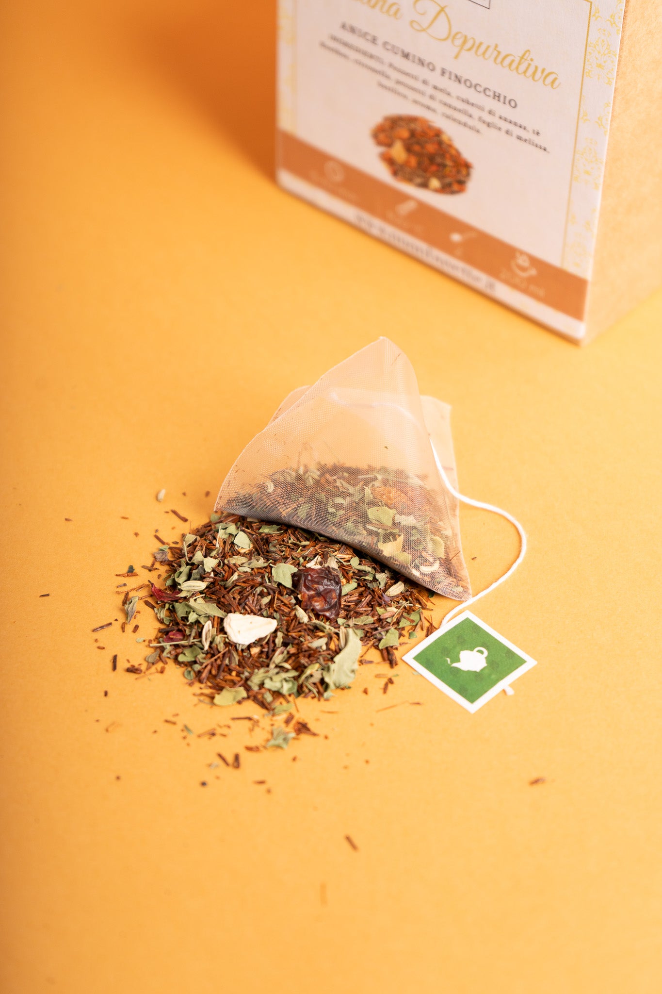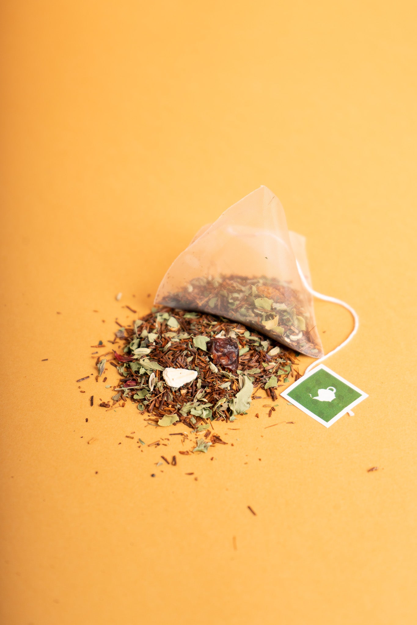Pezzettini di mela, cubetti di ananas, tè Rooibos, citronella, pezzetti di cannella, foglie di melissa, basilico, aroma, calendula