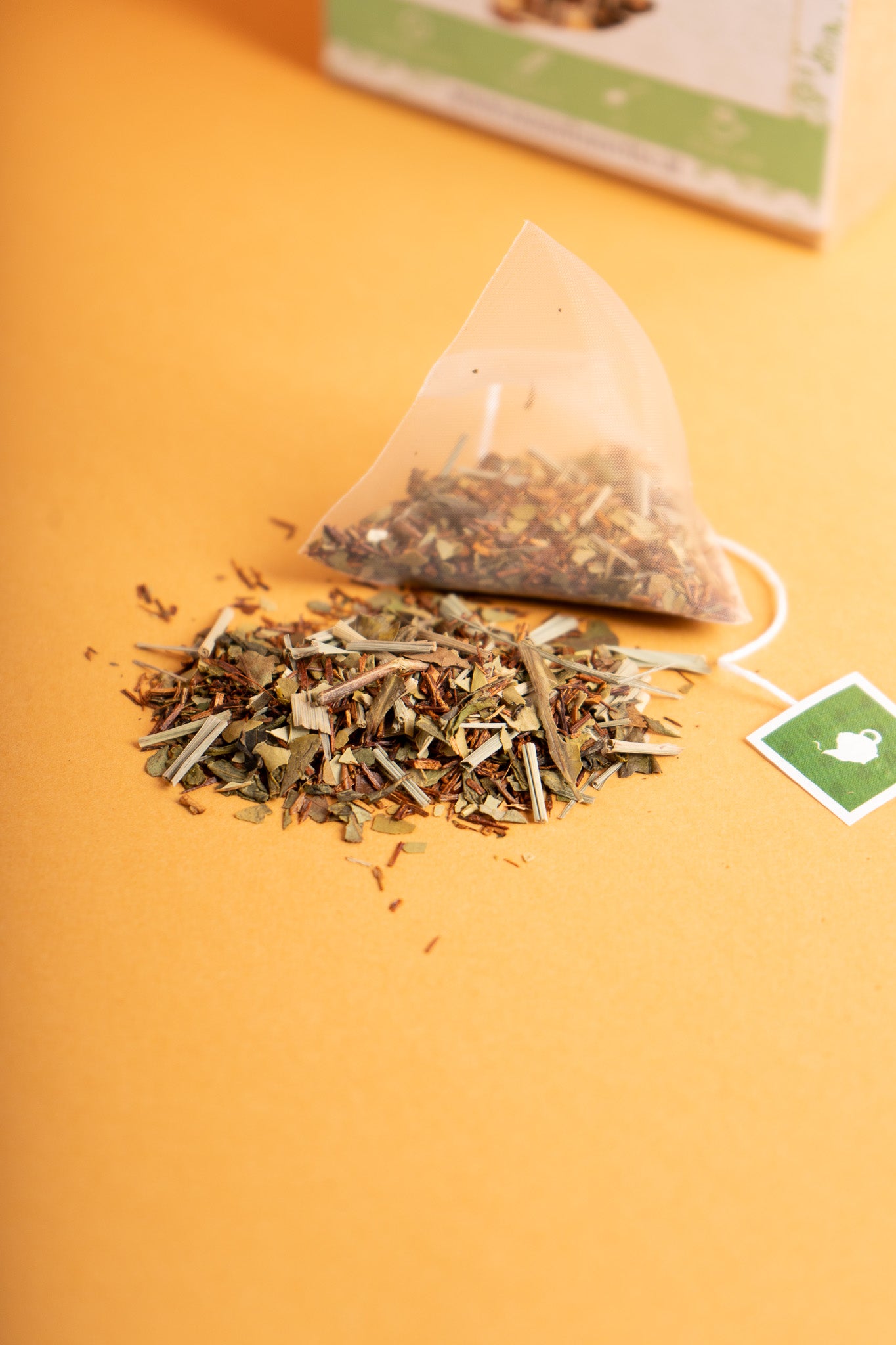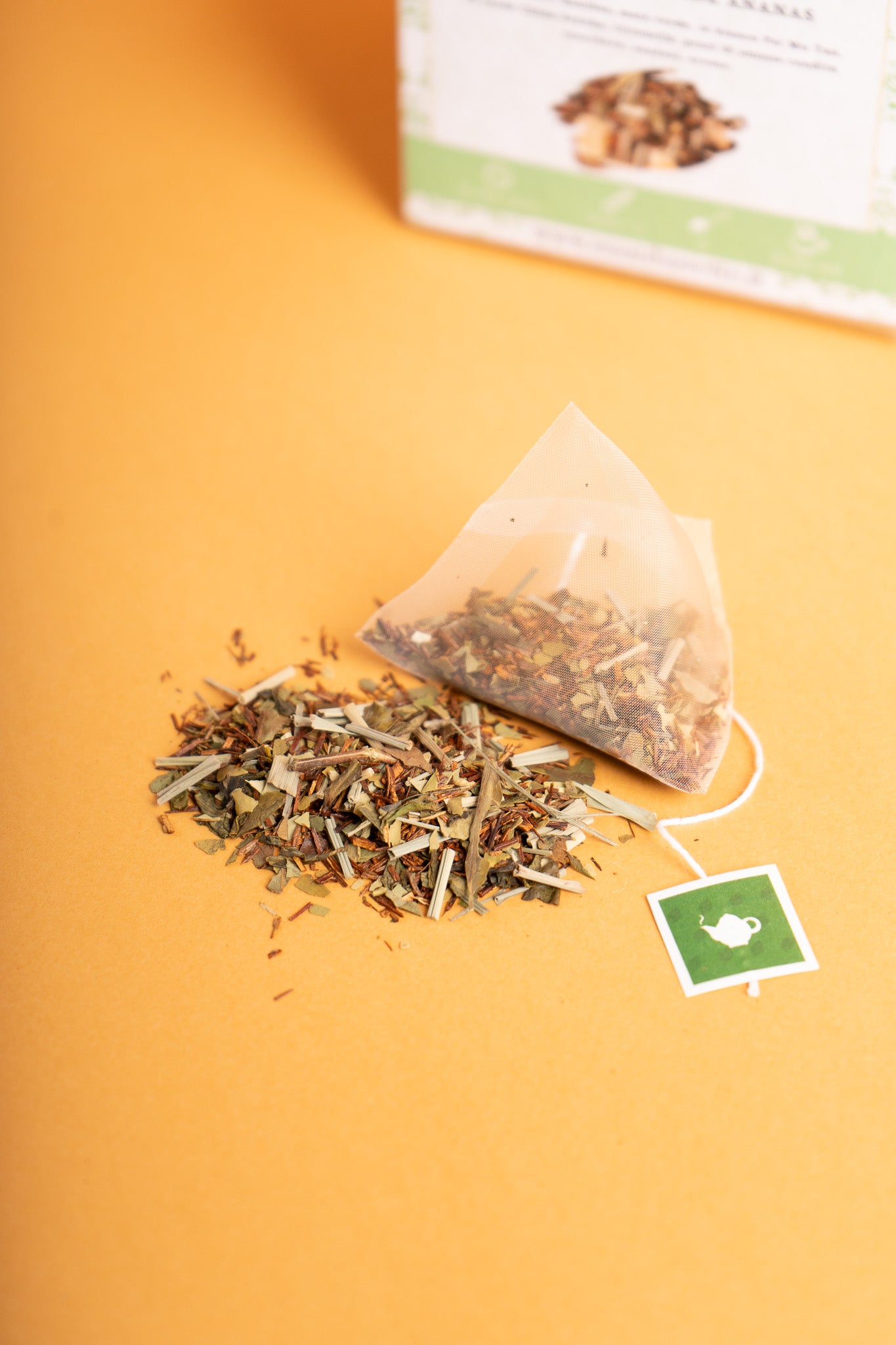 Rooibos, mate verde, tè bianco Pai Mu Tan, tè verde China Sencha, citronella, pezzi di ananas candito (zucchero, ananas), aroma